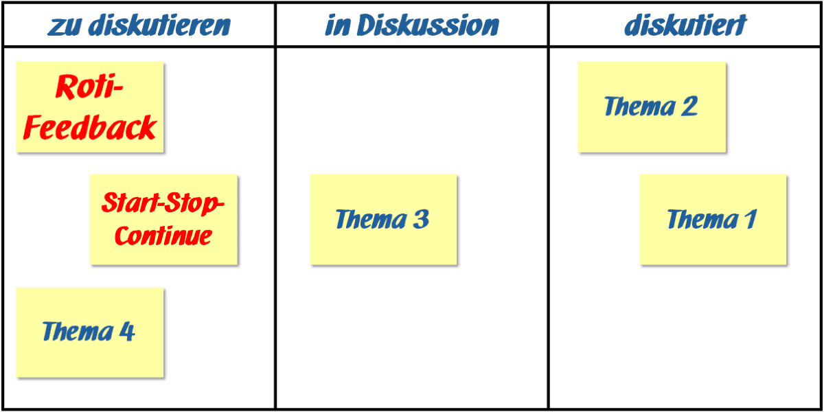 - Den Verlauf gerade multi-thematischer Meetings jetzt (ähnlich wie beim „Lean Coffee“6) auch noch mittels einer begleitenden Visualisierung zu strukturieren, ist im Sinne von „Lean“ m. E. zwar weder hinreichend noch notwendig, aber sicherlich ein schönes Tüpfelchen auf dem „i“.